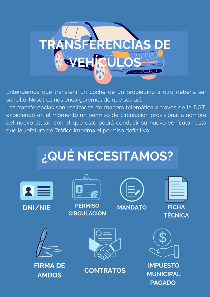 Si no tienes tiempo y quieres evitar desplazamientos, nosotros nos ocupamos de todo de forma sencilla. Nosotros nos desplazamos. Te enviamos los detalles por mail y nos ponemos en contacto contigo para recoger la documentación y entregar tu nuevo permiso de circulación.